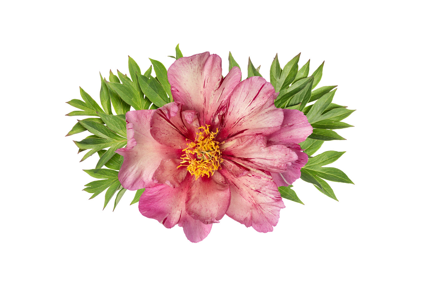 Make your border shine with the painterly color palette of the Itoh Peony ‘Anderson Kaleidoscope’. The large semi-double flowers display creamy pink petals that deepen toward the edges into raspberry and cherry, with playful brushstrokes and fine speckles, while the golden center catches the light beautifully. Each bloom is slightly different, making the plant feel like a living work of art. Strong stems hold the flowers neatly upright and make it an excellent cut flower that impresses in the vase as well. ‘Anderson Kaleidoscope’ is easy to care for, fully hardy, and content in a sunny spot or light partial shade in well-drained, fertile soil. It blooms richly in late spring and brings dynamism and luxury to modern borders, classic beds, and generous containers. Order today and give your garden an artistic explosion of color that will keep delighting season after season.